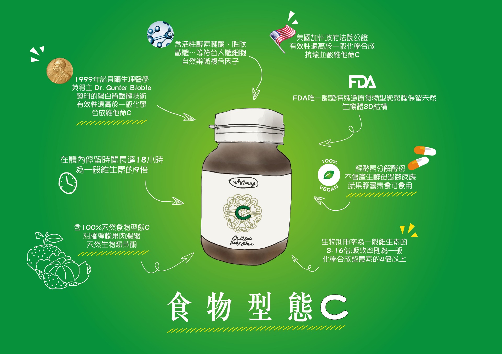 維生素C為人體內無法自行合成的營養素,必須每天補充,方能降低發炎、感染、感冒、因缺乏C而產生之各種危及健康的風險。